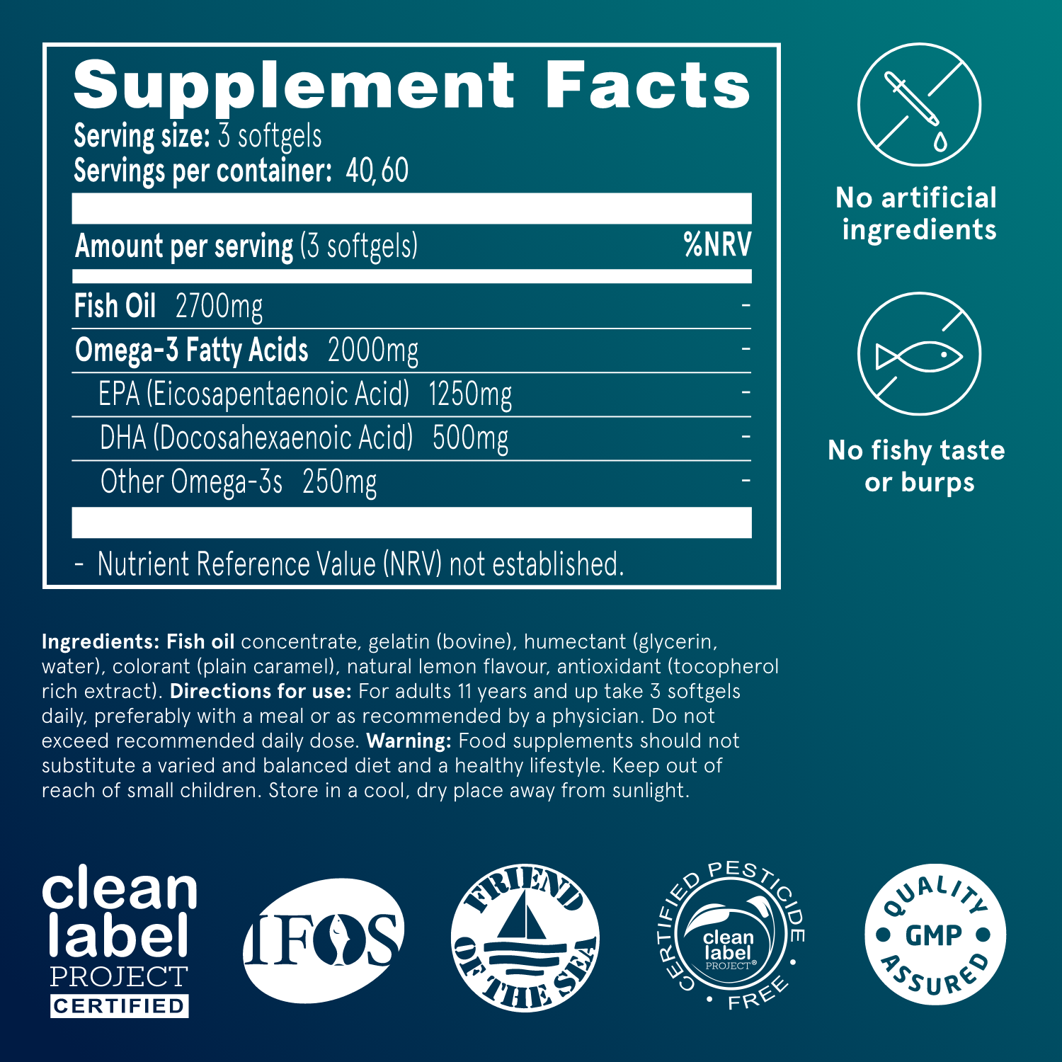 Concentrated, fresh fish oil. Each serving contains 2000mg omega-3 (1250 EPA 500mg DHA) and each batch is third party tested by IFOS for freshness and purity.