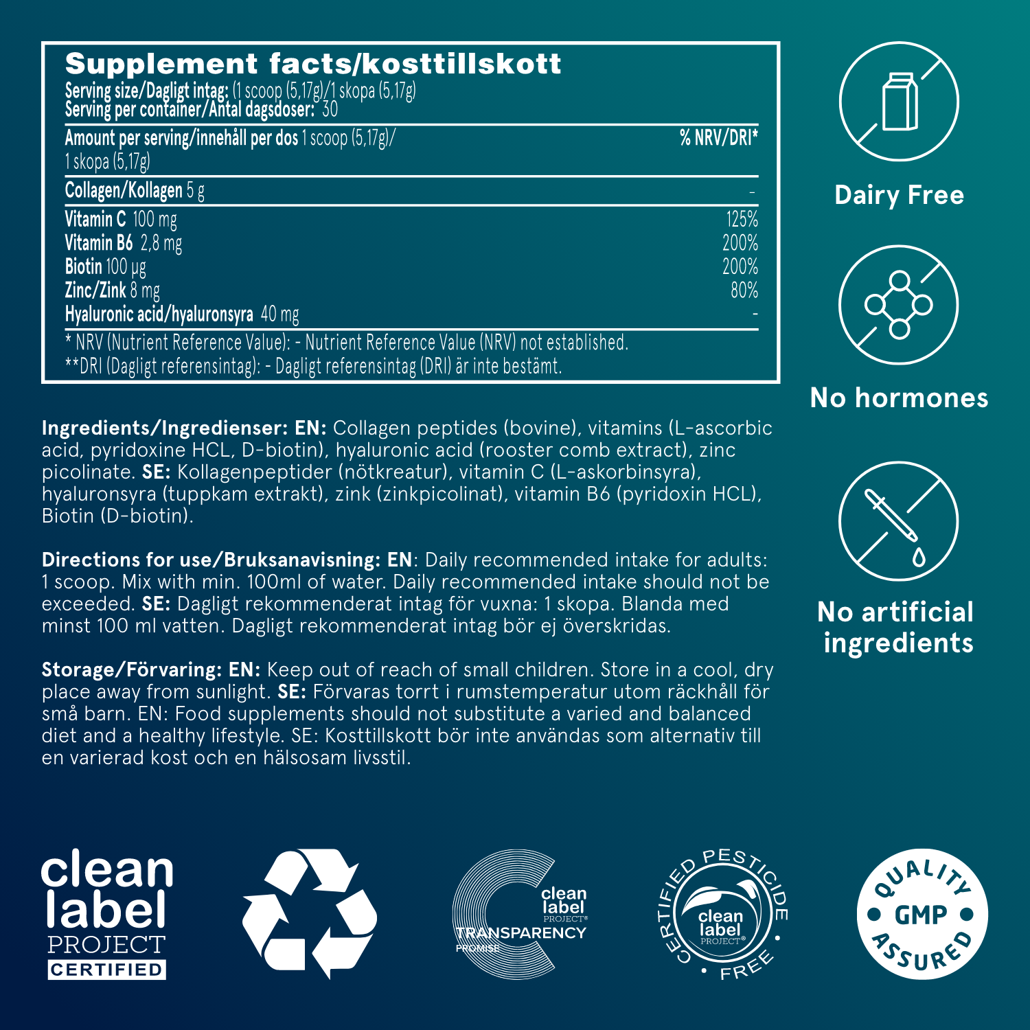 This powerful combination of collagen mixed with hyaluronic acid, biotin, vitamin B6, zinc and vitamin C, is designed to support your body's ability to naturally revive the skin and hair.