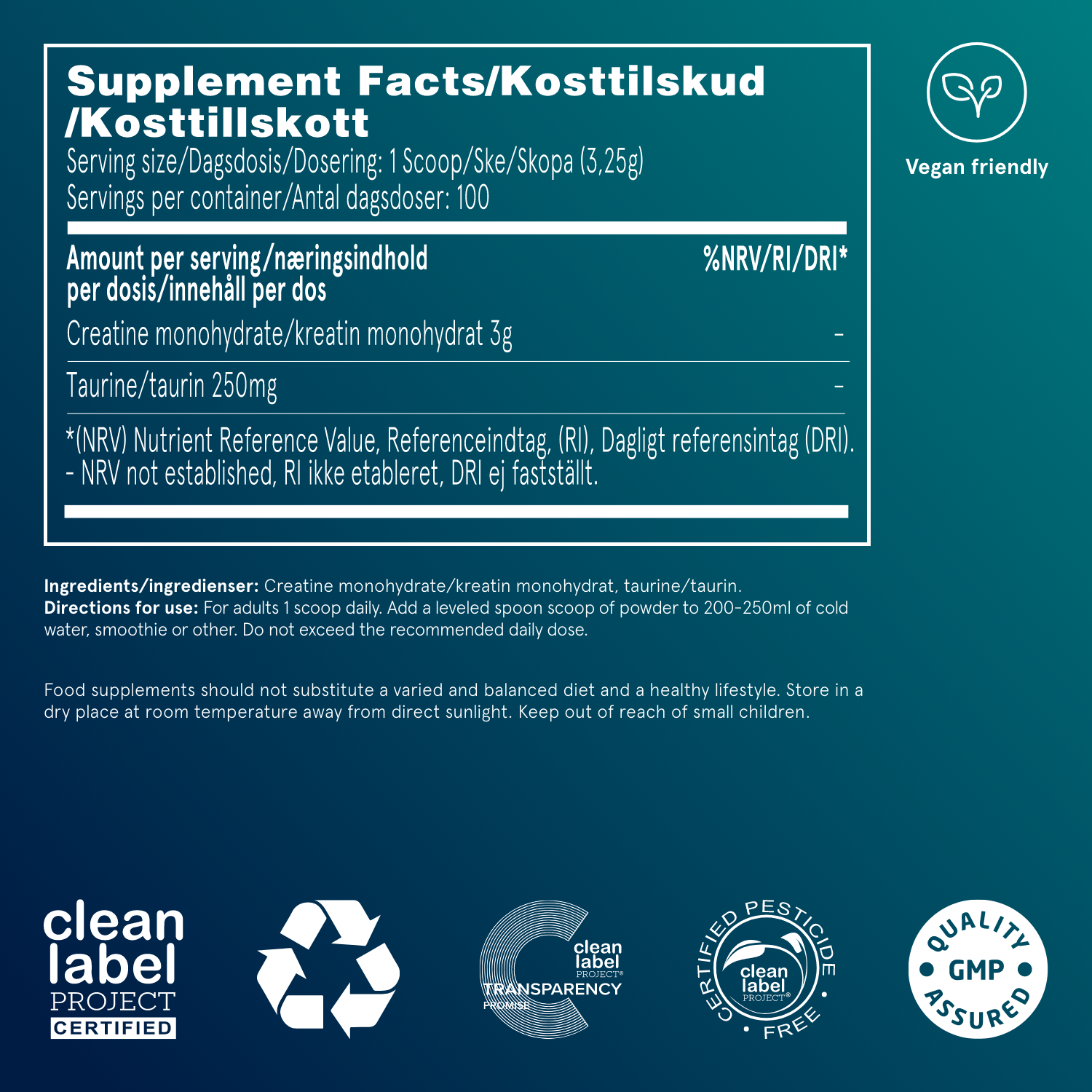 Creatine increases physical performance in successive bursts of short-term, high-intensity exercise. Puori Creatine+ combines creatine and taurine into an unflavoured powder. The effect is obtained with a daily intake of 3g of creatine.